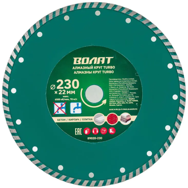 Круг алмазный универсальный Волат Turbo 230 х 22 мм для сухой и мокрой резки гранита, кирпича, бетона, строительного камня, тротуарной плитки и других твердых материалов. Высокая скорость резания. Сухой рез. Охлаждение водой увеличивает ресурс круга.