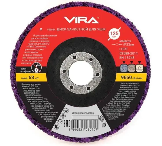 Круг зачистной 125 мм VIRA 558044 для снятия ржавчины, краски, герметиков и других материалов. Предназначен для работы с УШМ.