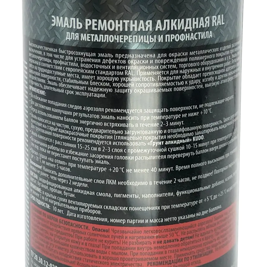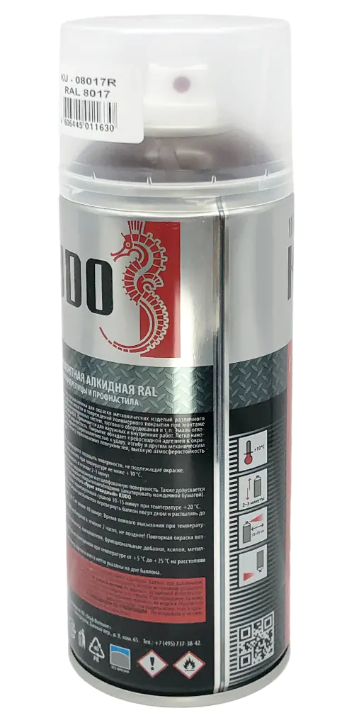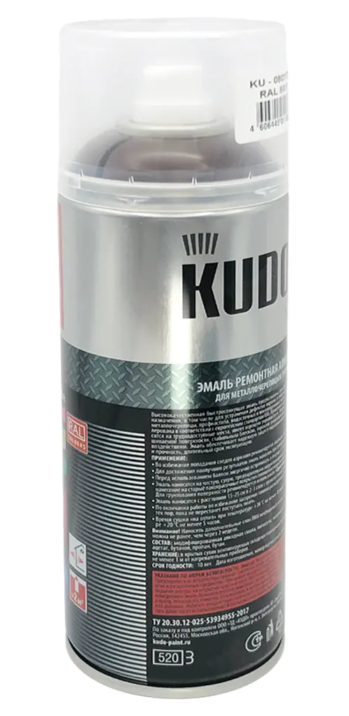Высококачественная алкидная ремонтная эмаль KUDO KU-08017R коричневого цвета выпускается в аэрозольном баллоне, который позволяет равномерно окрашивать изделия со сложной геометрией и прокрашивать труднодоступные участки.