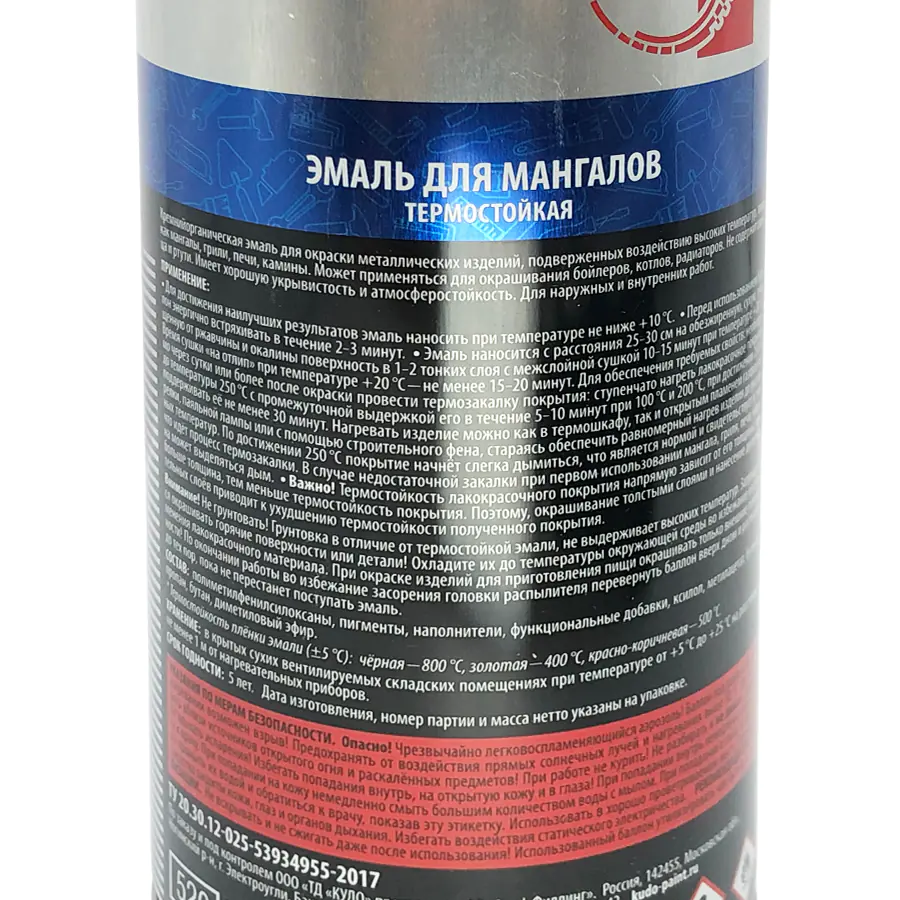 Термостойкая эмаль для мангалов KUDO черная используется для окрашивания металлических изделий, подверженных нагреванию до 800ºС (мангалы, грили, печи, камины). Продукт применяют внутри и снаружи помещений для обработки бойлеров, котлов и радиаторов. Состав легко наносится на труднодоступные места благодаря аэрозольному распылению.