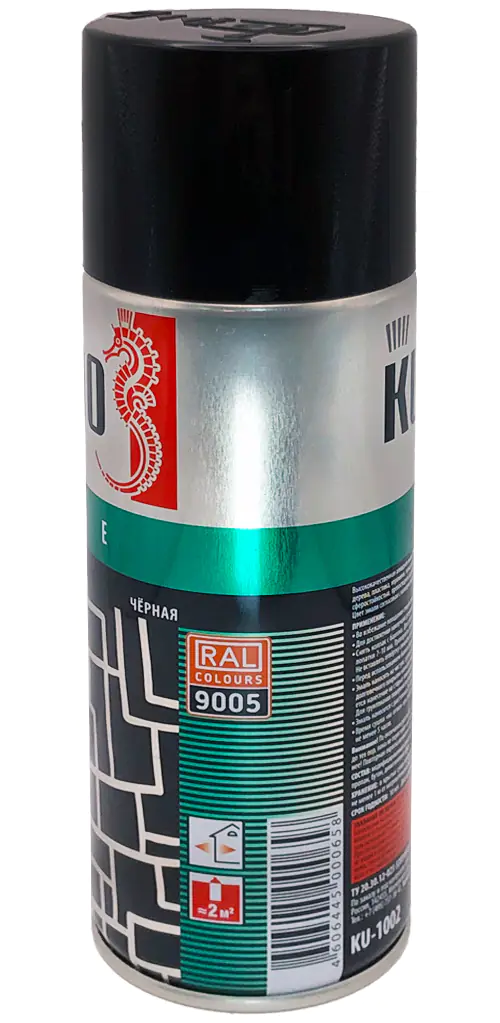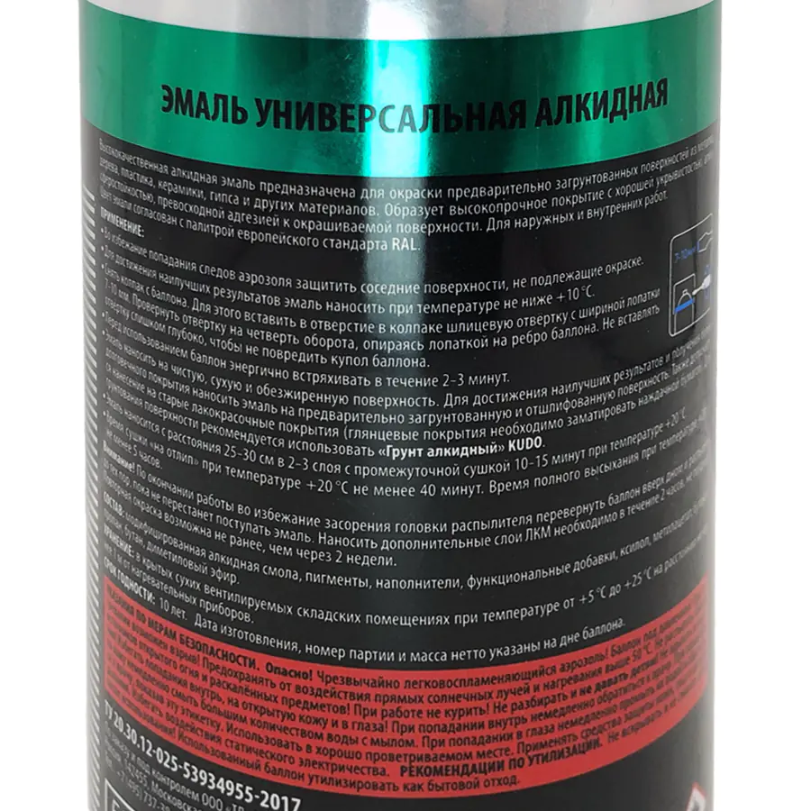 Универсальная эмаль KUDO черная глянцевая KU-1002 предназначена для окраски предварительно загрунтованных металлических и деревянных поверхностей. Аэрозольная краска легко наносится на труднодоступные места. Образует долговечное покрытие с хорошей укрывистостью, атмосферостойкостью, превосходной адгезией к окрашиваемой поверхности. Имеет высокую твердость, светостойкость и стойкость к растворителям. Применяется для наружных и внутренних работ.
