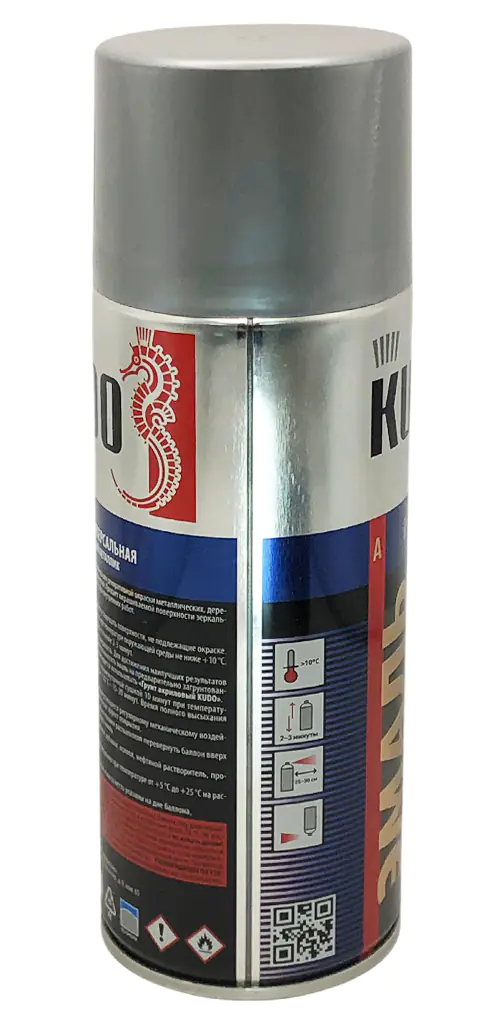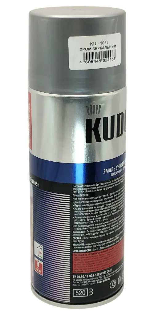 Универсальная эмаль металлик KUDO зеркальный хром KU-1033 используется для декоративной окраски поверхностей из металла, дерева, пластмассы, гипса и керамики. Состав применяют во время строительных ремонтных и отделочных работ внутри и снаружи помещений. Продукт легко наносится в труднодоступных местах благодаря аэрозольному распылению. После высыхания покрытие обладает насыщенным ярким металлическим блеском.