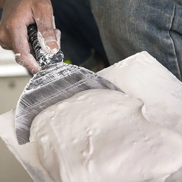 Гипс строительный засыпать в емкость с чистой холодной водой (в соотношении 1 кг на 0,6-0,7 л воды) и затем перемешать шпателем до получения однородной массы, имеющей консистенцию густой сметаны. Загрязненные емкости и инструменты сокращают время использования растворной смеси.