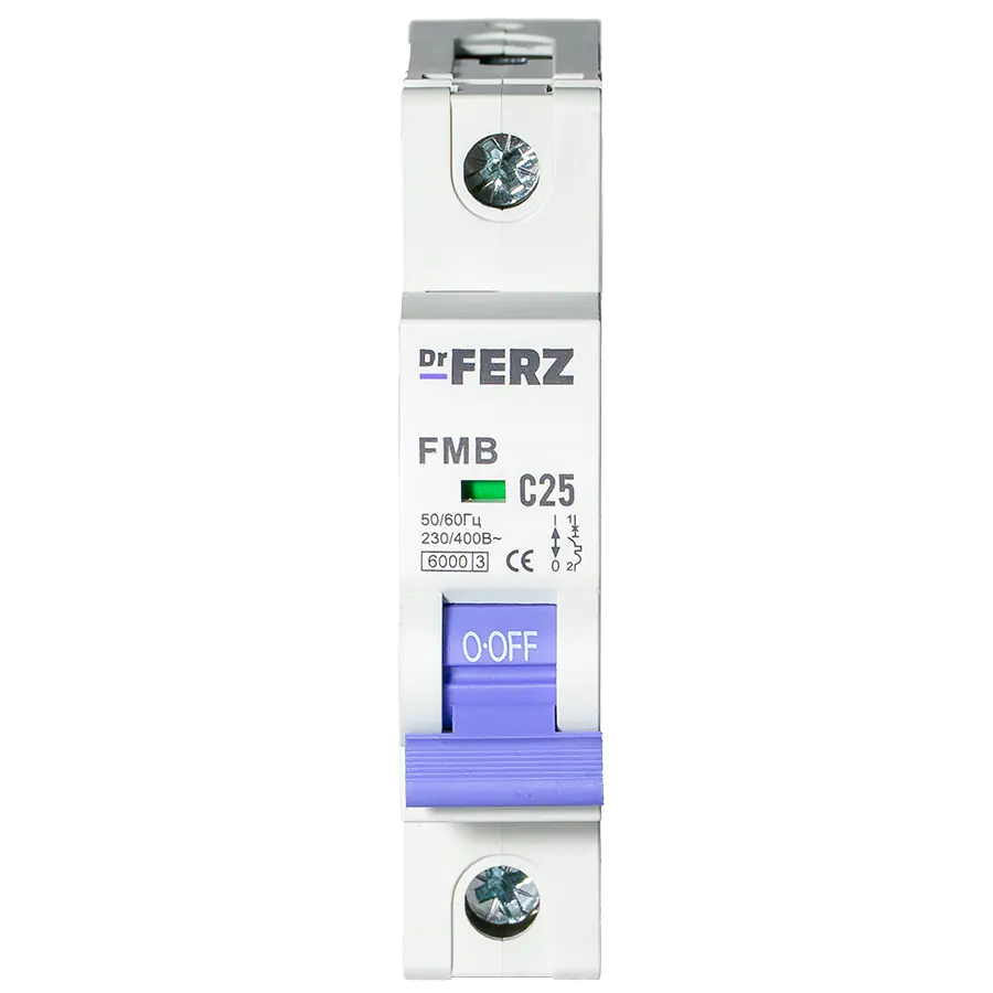 Автоматические выключатели Dr.FERZ 6kA 1P 25A тип С серии FMB – надёжное решение для защиты электрических цепей от перегрузок и коротких замыканий. Устройства рассчитаны на работу в сетях переменного тока с напряжением 230/400 В и частотой 50/60 Гц. Подходят для установки в распределительных щитах жилых, коммерческих и промышленных объектов, обеспечивают безопасное управление цепями и соответствуют современным стандартам электробезопасности.