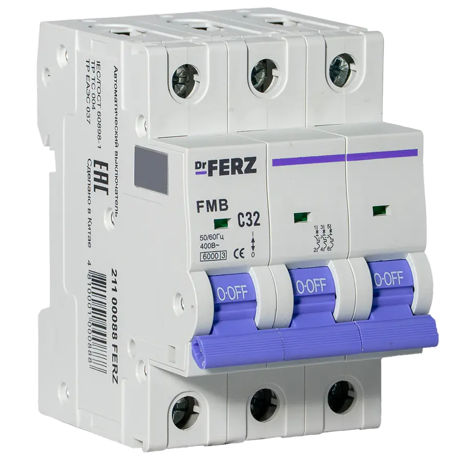 Автоматические выключатели Dr.FERZ 6kA 3P 32A тип С серии FMB – надёжное решение для защиты электрических цепей от перегрузок и коротких замыканий. Устройства рассчитаны на работу в сетях переменного тока с напряжением 230/400 В и частотой 50/60 Гц. Подходят для установки в распределительных щитах жилых, коммерческих и промышленных объектов, обеспечивают безопасное управление цепями и соответствуют современным стандартам электробезопасности.