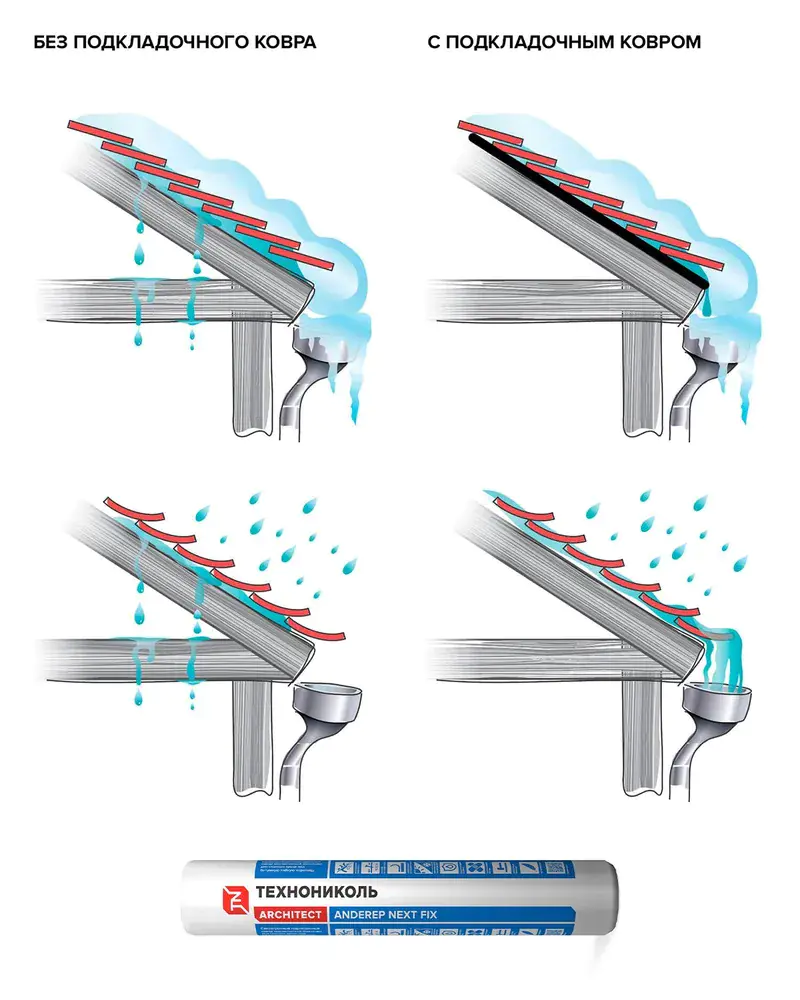 Применяется в качестве подкладочного гидроизоляционного ковра в конструкциях скатных крыш с финишным покрытием из битумной черепицы.