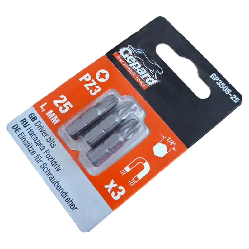 Бита магнитная для шуруповерта PZ3 Gepard GP3505-25 применяется в качестве сменной насадки к шуруповерту и другим инструментам при монтаже и демонтаже саморезов в мягкие поверхности, дерево и металл со средним шагом резьбы, помеченными маркировкой UP и/или оснащенными шлицами стандарта Pozi. Выполнена из легированной инструментальной стали S2 с увеличенным содержанием ванадия. В упаковке 3 шт.