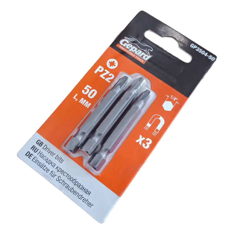 Бита магнитная для шуруповерта PZ2 Gepard GP3504-50 применяется в качестве сменной насадки к шуруповерту и другим инструментам при монтаже и демонтаже саморезов в мягкие поверхности, дерево и металл со средним шагом резьбы, помеченными маркировкой UP и/или оснащенными шлицами стандарта Pozi. Выполнена из легированной инструментальной стали S2 с увеличенным содержанием ванадия. В упаковке 3 шт.