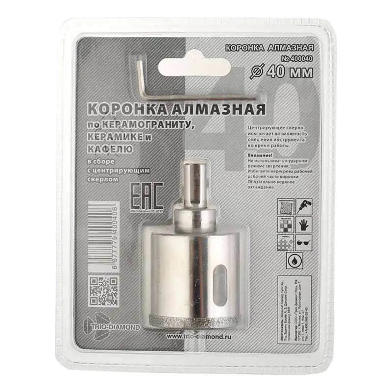 Коронка алмазная 40 мм Trio-Diamond для работы с водяным охлаждением в безударном режиме сверления по керамике и кафелю. Поставляется в сборе с центрирующим сверлом.