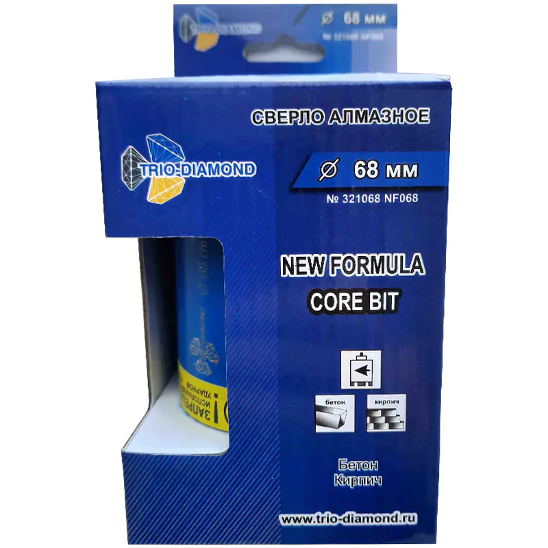 Коронка алмазная 68 мм Trio-Diamond New Formula для работы с водяным охлаждением в безударном режиме сверления по бетону, кирпичу и мрамору. Поставляется в сборе с центрирующим сверлом SDS+.