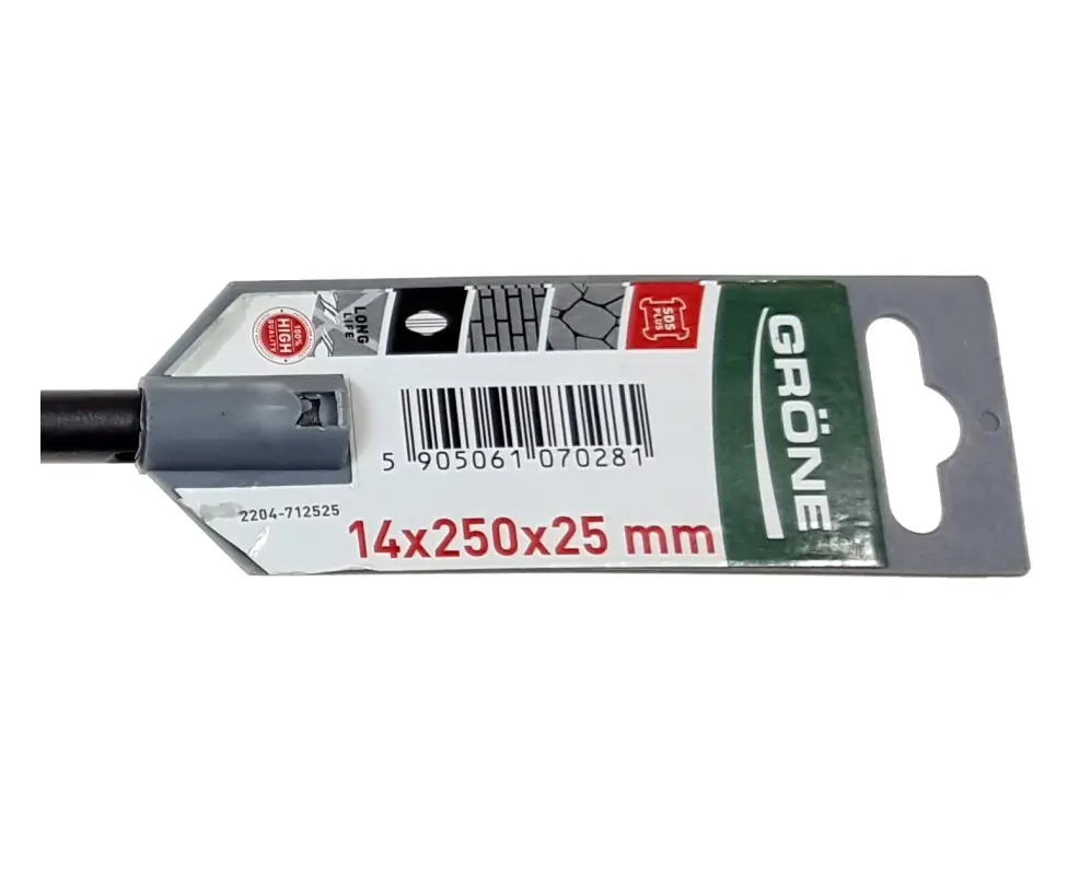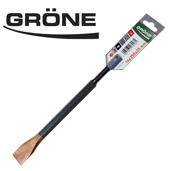 Плоское зубило Grone SDS-Plus для тяжёлых работ по долблению в бетоне, асфальту, кирпичной кладке, плитке и т.д. Зубило применяется с перфораторами, имеет общую длину 250 мм и ширину 25 мм.