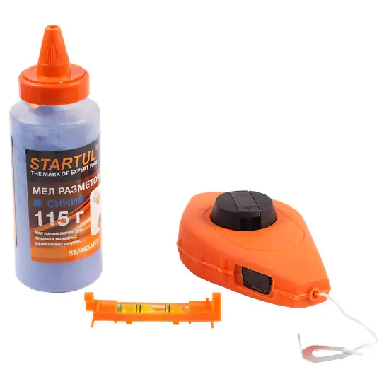 Разметочный шнур получил широкое применение в строительстве. Используется для разметки и маркировки прямых линий при выполнении кладочных, малярных и отделочных работ. Изготавливается из крепких синтетических материалов, стойких к разрыву. Для удобства применения используются красящие материалы – мел или специальная краска, чтобы разметка была более заметной. Наматывается шнур на катушку, изготовленную из пластика. В комплект входит разметочный мел 115 г и пузырьковый уровень.