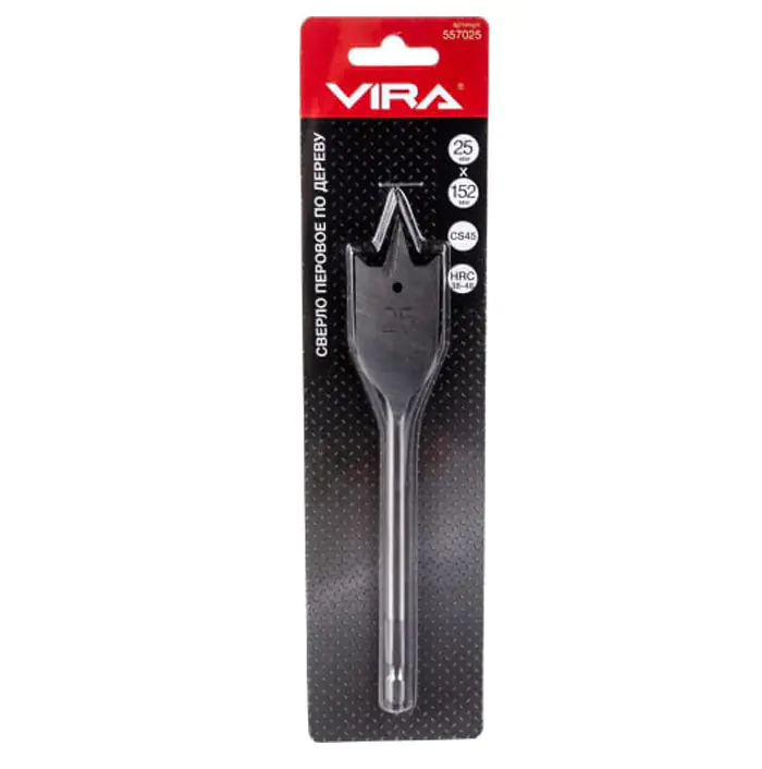 Сверло VIRA перовое по дереву 25х152 мм используется в комплексе с ударными дрелями для сверления отверстий в ДСП, ДВП, фанере, ламинате, тонких досках, а также во всех породах твёрдого и мягкого дерева. Сверло выполнено из высококачественной инструментальной стали, что обеспечивает высокую прочность и сохранение режущих качеств инструмента даже после длительного использования. Сверло имеет центрирующее остриё для чистых и точных отверстий. Боковые режущие грани способствуют лёгкому отводу стружки из места обработки.