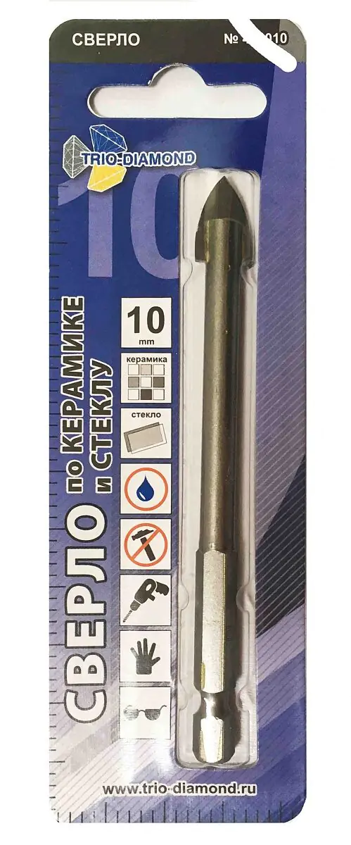 Сверло по кафелю и стеклу твердосплавное копьевидное 10х48 мм TRIO-DIAMOND (430010) предназначено для работы шуруповертом, дрелью в безударном режиме. Мокрый тип сверления. Назначение: керамика, стекло.