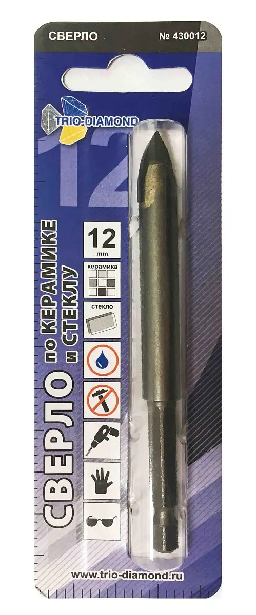 Сверло TRIO-DIAMOND 430012 предназначено для дрелей. Применяется для выполнения отверстий в керамической плитке и стекле. Имеет твердосплавную напайку в форме копья. Сверление следует проводить на низких скоростях, в безударном режиме, с достаточным охлаждением сверла и места сверления.