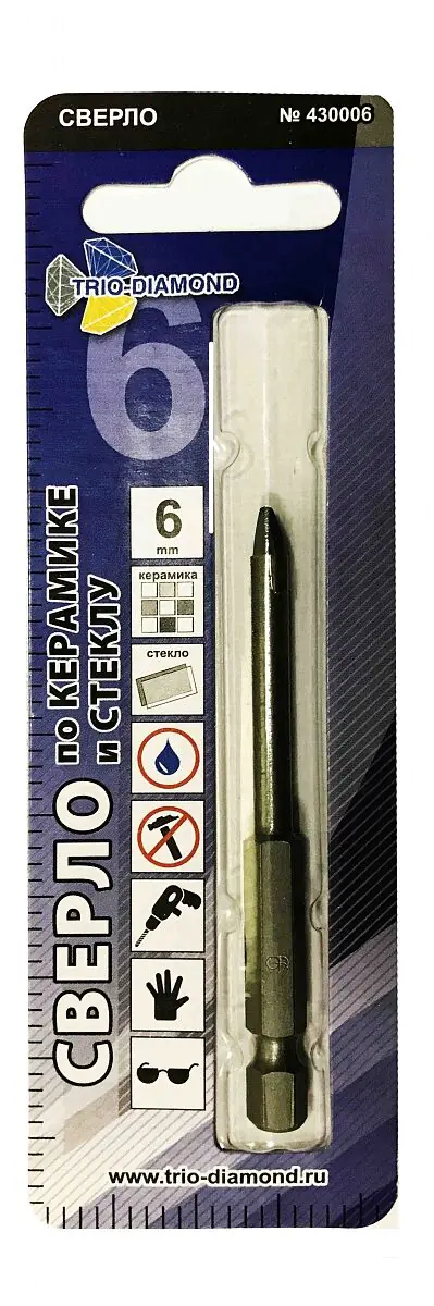 Сверло по кафелю и стеклу твердосплавное копьевидное 6х39 мм TRIO-DIAMOND (430006) предназначено для работы шуруповертом, дрелью в безударном режиме. Мокрый тип сверления. Назначение: керамика, стекло.