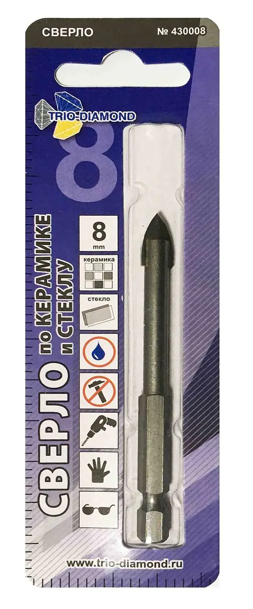 Сверло по кафелю и стеклу твердосплавное копьевидное 8х44 мм TRIO-DIAMOND (430008) предназначено для работы шуруповертом, дрелью в безударном режиме. Мокрый тип сверления. Назначение: керамика, стекло.