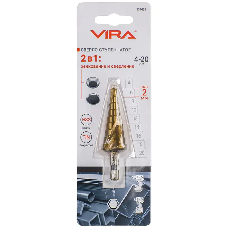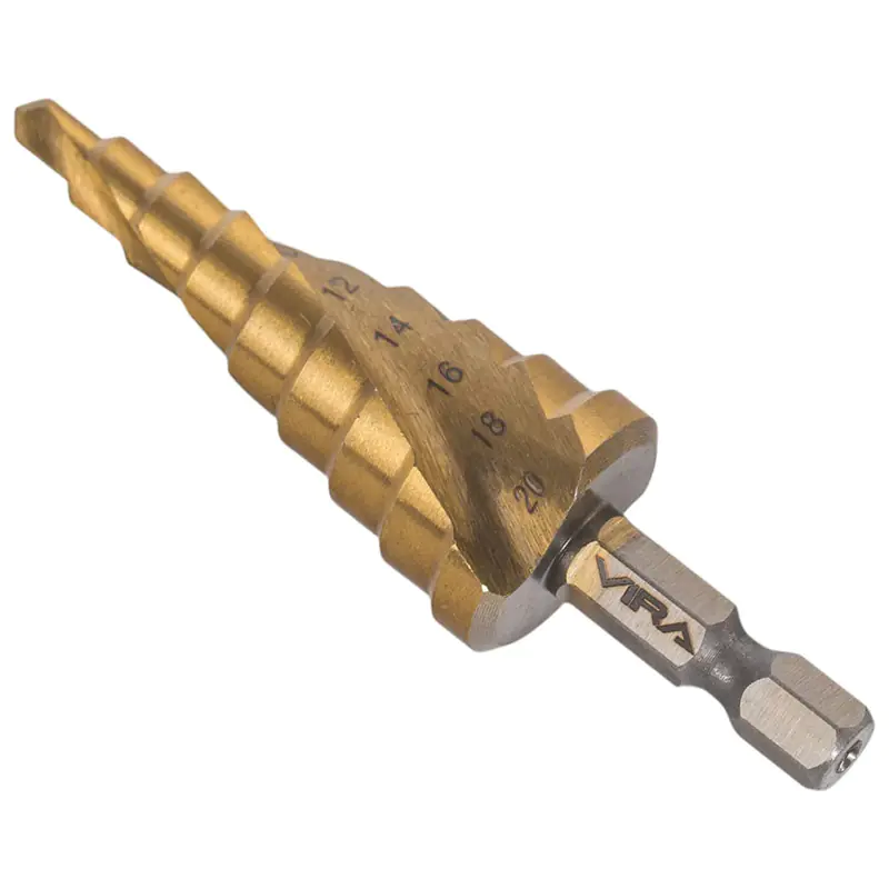Ступенчатое сверло со спиральной канавкой предназначено для получения отверстий различного диаметра без перестановки режущего инструмента в изделиях из цветных металлов, тонколистовом металле и твердом пластике. Конструкция сверла обеспечивает оптимальный отвод стружки из зоны сверления. Специальная спиральная канавка служит для увеличения плавности и скорости работы по сравнению с обычным ступенчатым сверлом. Нитридтитановое покрытие обеспечивает дополнительную износостойкость. В результате увеличивается срок службы и качество работы. А шестигранный хвостовик надёжно фиксируется в патроне инструмента.