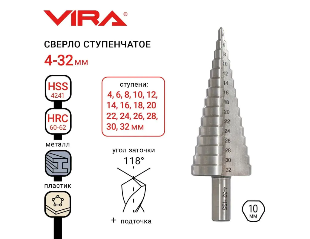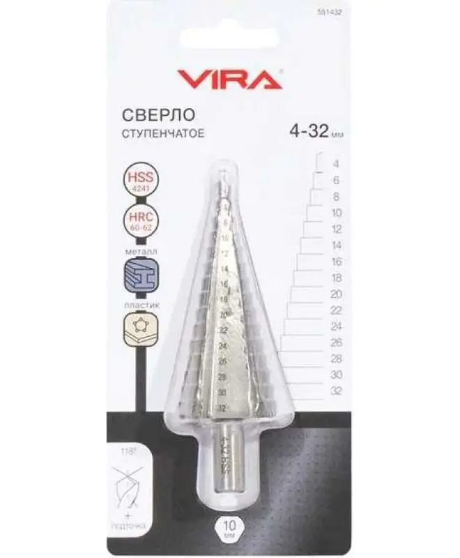 Ступенчатое сверло VIRA RAGE 551432 предназначено для получения отверстий различного диаметра без перестановки режущего инструмента в изделиях из цветных металлов, тонколистовом металле и твердом пластике. Сверло выполнено из высококачественной быстрорежущей легированной стали HSS4241 твердостью 60-62 HRC, которое увеличивает износостойкость инструмента. Надежную фиксацию сверла в патроне инструмента обеспечивает трехгранный хвостовик, который позволяет устанавливать его во все электроинструменты, оснащённые быстрозажимным патроном.