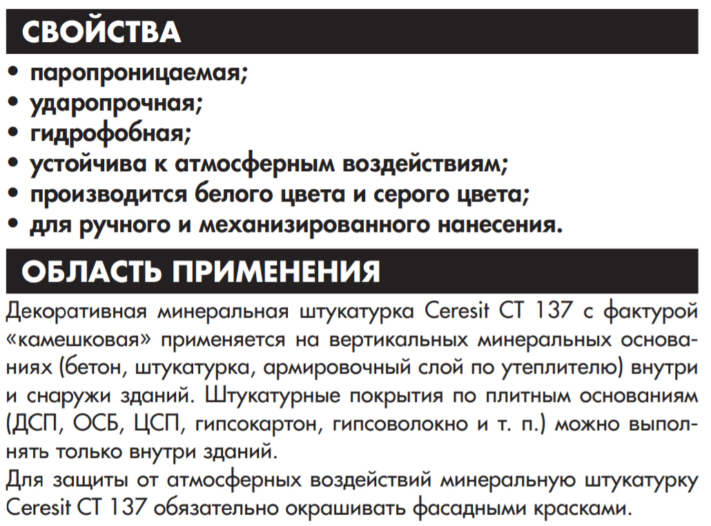 Штукатурка Ceresit CT 137 предназначена для выполнения декоративного тонкослойного покрытия на бетонных основаниях, традиционных штукатурках, гипсовых основаниях, плитах ДСП, гипсокартоне и т.п. Может также служить в качестве декоративно-защитного слоя в легких штукатурных системах утепления наружных стен зданий при использовании в качестве утеплителя как минераловатных, так и пенополистирольных плит. Штукатурка Ceresit CT 137 производится белого цвета, а также в версии под окраску. Окраску штукатурки можно производить акриловой краской Ceresit CT 42 (через 7 суток), силикатной краской Ceresit CT 54 (через 3 суток) и силиконовой краской Ceresit CT 48 (через 7 суток).