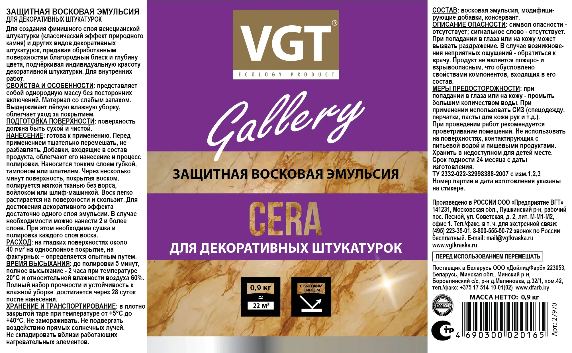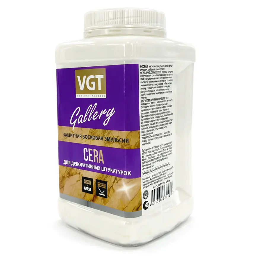 Эмульсия защитная восковая VGT предназначена для создания финишного слоя венецианской штукатурки (классический эффект природного камня) и других видов декоративных штукатурок, придавая обработанным поверхностям благородный блеск и глубину цвета, подчёркивая индивидуальную красоту декоративной штукатурки. Для внутренних работ.