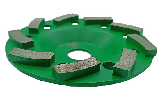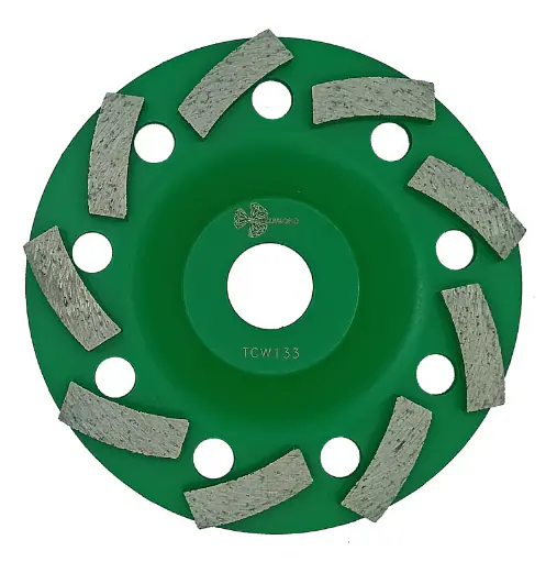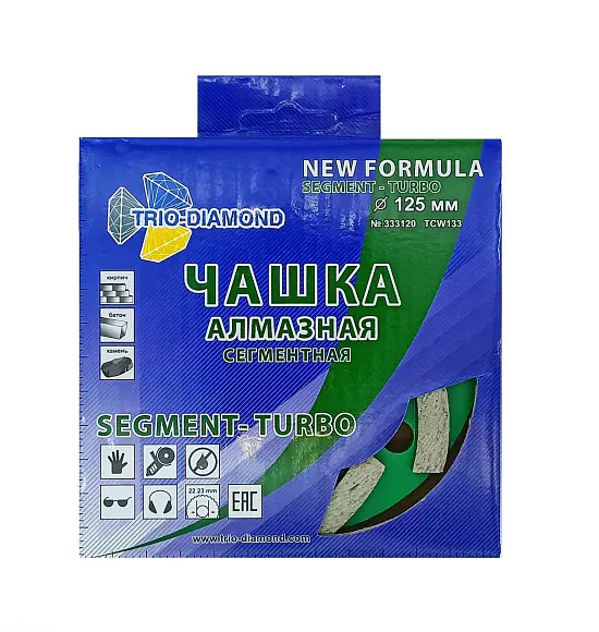 Алмазная чашка Сегмент-Турбо TCW133 – инструмент для шлифовки и обработки поверхностей из бетона, гранита, природного и искусственного камня. Применяется для быстрого и безопасного удаления выпуклых и неровных участков бетонных, гранитных и других особо твердых поверхностей. Изделие является сменной составной частью углошлифовальных или мозаично-шлифовальных машин, имеющих посадку 22,23 миллиметра.