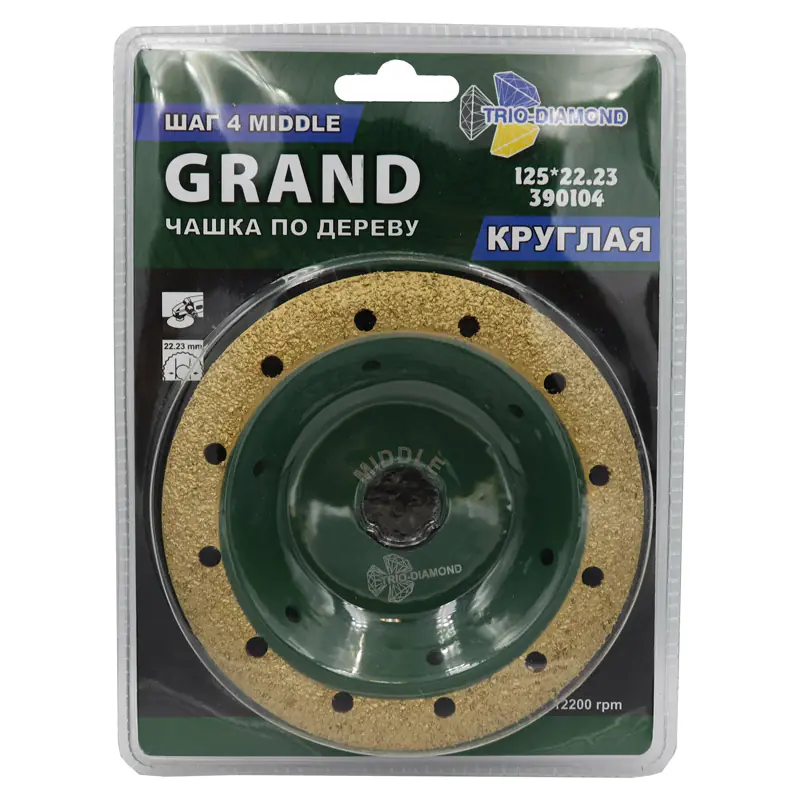 Чашка по дереву круглая Grand шаг 4 Middle 125 мм Trio-diamond 390104. Назначение: мягкая и твердая древесина, пластмасса, песчаник, силикатный кирпич, газобетон. Чашка имеет напайки из карбида вольфрама, округлую форму рабочей кромки. Используется для грубых и деликатных шлифовальных работ, а также для декорирования поверхностей различных материалов.