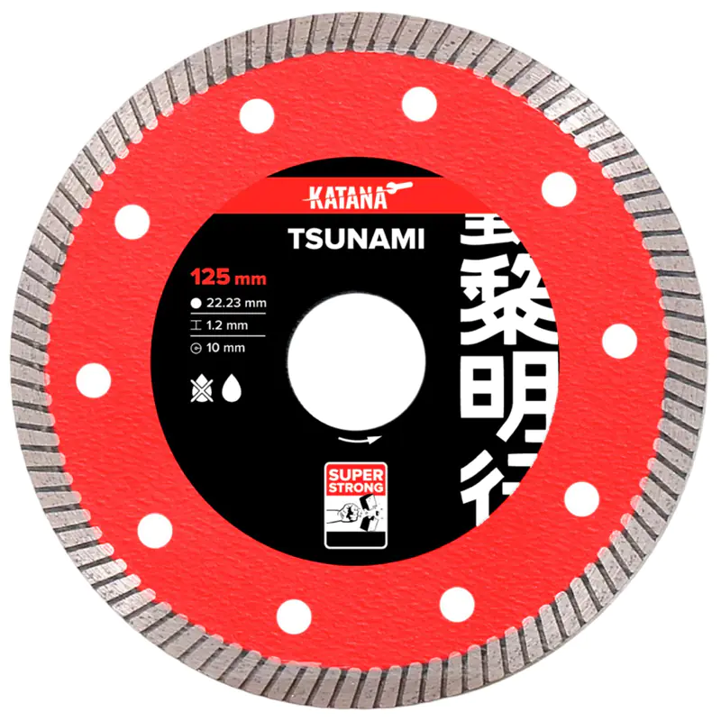 Алмазный отрезной диск для болгарки диаметром 125 мм TSUNAMI с волнообразной рабочей поверхностью обеспечивает тонкий рез без сколов даже при работе с самыми прочными материалами. Турбированные пазы алмазоносного слоя эффективно врезаются в материал, охлаждая зону резки. Диск эффективно режет даже самый толстый керамогранит. Диск изготовлен по технологии горячего прессования, что обеспечивает увеличенный ресурс работы. При изготовлении этого диска использовались японские технологии – передовые в сфере производства режущего инструмента, что гарантирует чистый рез без сколов.