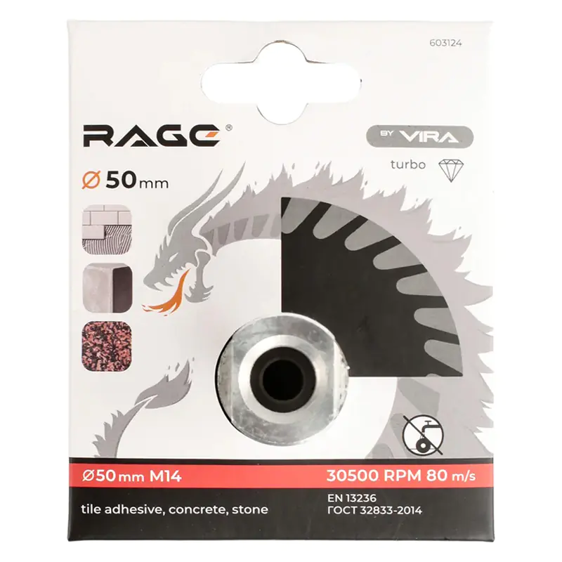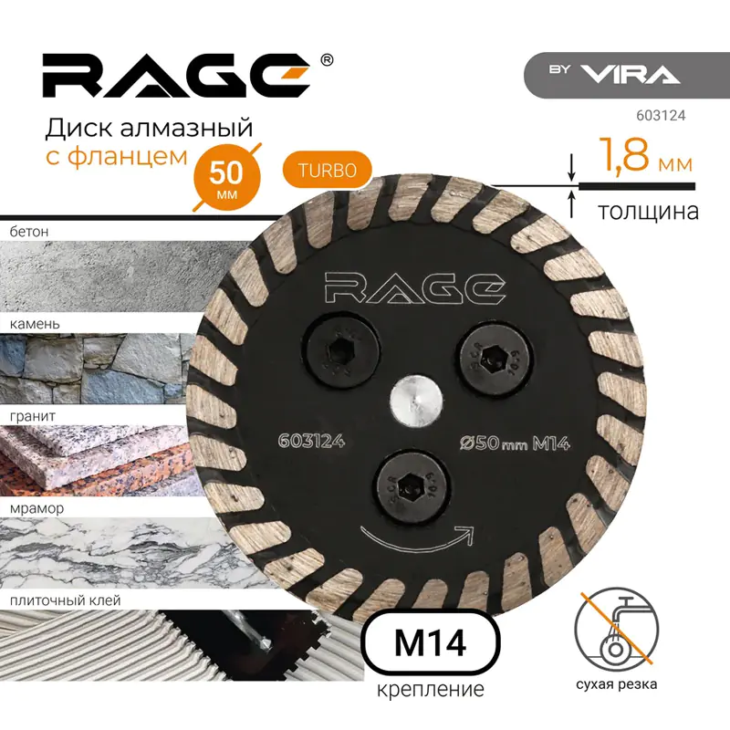 Алмазный Турбо диск с фланцем VIRA RAGE изготовлен методом горячего прессования. Наличие фланца М14 (высотой 40 мм) позволяет устанавливать данный диск на УШМ без зажимной гайки, но и значительно усиливает корпус диска, что дает возможность работать с материалом под любым углом, создавая дополнительные возможности в работе. Подходит для подрезки отверстий в плиточном клее при установке СВП.