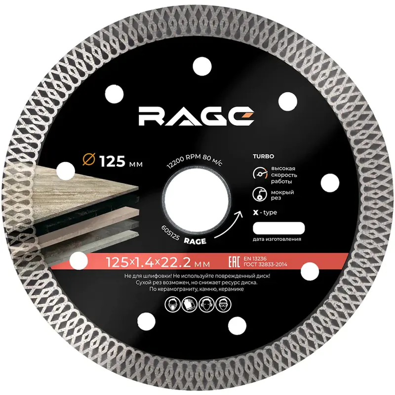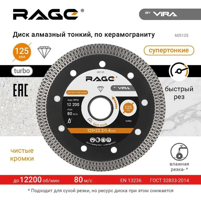 Специализированный тонкий диск для резки керамогранита, твердой и мягкой керамической плитки, плит из искусственного и натурального камня. Высокая концентрация алмазов мелкой фракции и минимальная толщина диска обеспечивают высокую скорость реза. Предназначены для профессионального применения и рекомендованы для большого объема работ. Для уменьшения пылеобразования и увеличении ресурса диска рекомендуется использовать охлаждение водой.