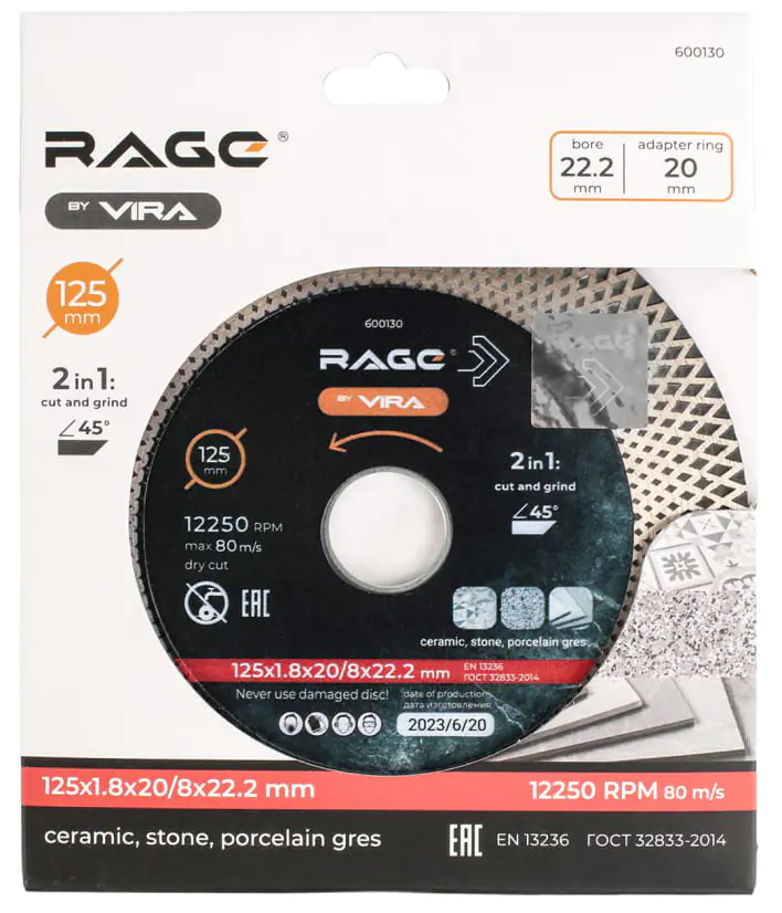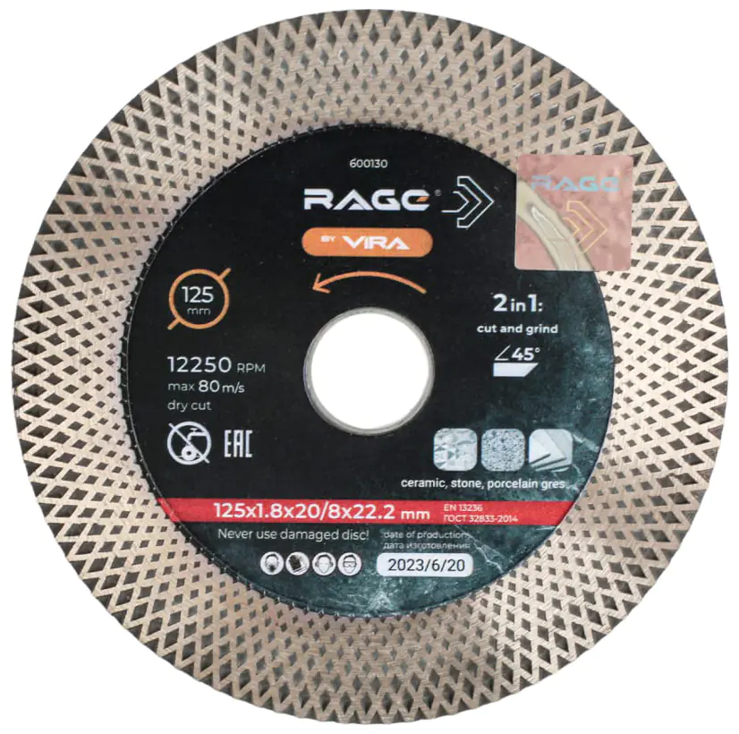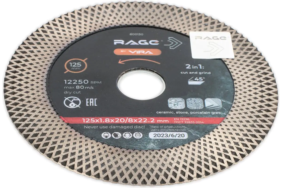 Высота алмазного слоя диска − 20 мм на лицевой стороне для заусовки. Толщина диска 1,8 мм обеспечивает достаточную жесткость при резке под углом и подшлифовки.