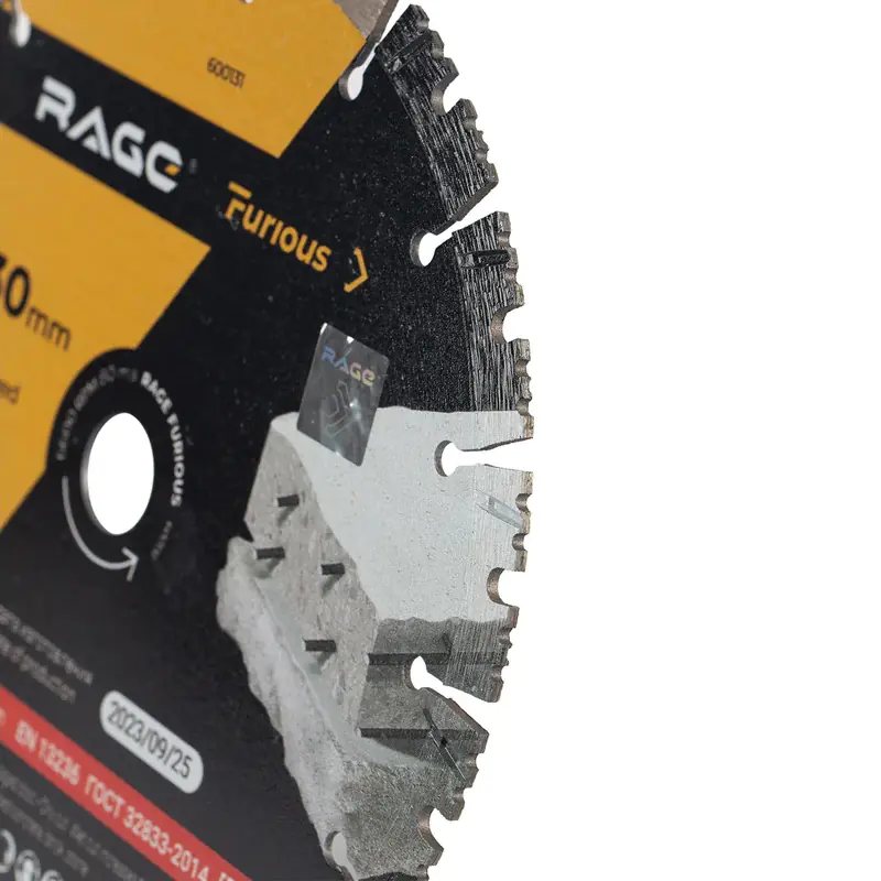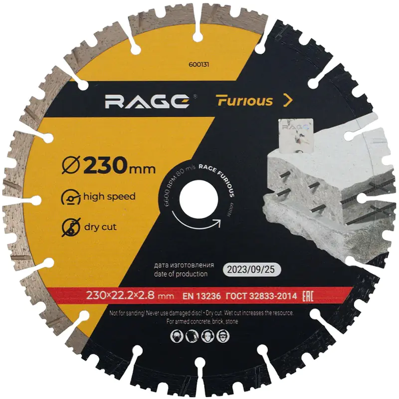 Диск алмазный сегментированный по железобетону и камню 230 мм RAGE Furious предназначен для обработки бетона (в том числе железобетон, шлакобетон), искусственного и натурального камня, кирпича, кровельных материалов. Подходит для сухой и мокрой резки. Высокая скорость работы с твердыми материалами достигнута благодаря турбо-сегментной форме диска, плотному алмазному слою, жесткому корпусу. Длительный ресурс диска обеспечен сегментной кромкой и дополнительным охлаждением.