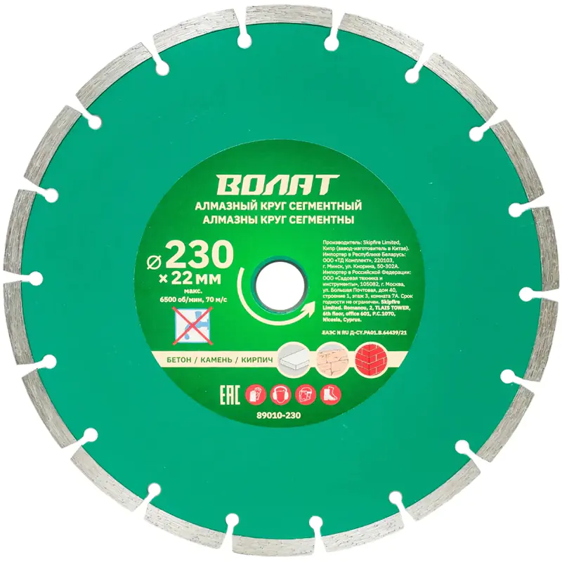 Круг алмазный сегментированный Волат 230 х 22 мм для сухой резки асфальтового полотна, бетона, гранита, кирпича, камня и других твердых материалов. Высокая скорость резания, точная резка. Сухой рез.