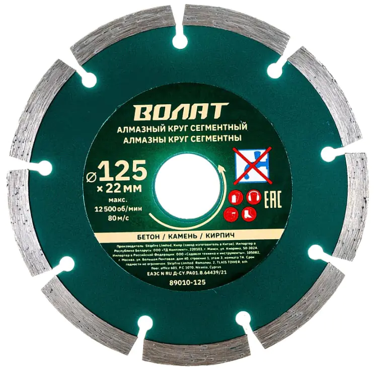 Круг алмазный сегментированный Волат 125 х 22 мм для сухой резки асфальтового полотна, бетона, гранита, кирпича, камня и других твердых материалов. Высокая скорость резания, точная резка. Сухой рез. Высота алмазного слоя: 7,5 мм. Диаметр: 125 мм. Посадка: 22,2 мм. Толщина реза: 2,2 мм.