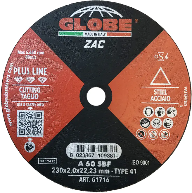 Круг отрезной GLOBE ZAC 230х2,0x22,2 мм для металла – сложная штамповочная технология создает узор спиральной формы на обеих поверхностях круга. Узор являет собой чередование низких и рельефных зон. Такое решение помогает снизить трение боковых поверхностей с металлом тем самым, не перегреваясь. Чередование этих спиральных "ребер" дает небывалую жесткость, позволяя производить точные и ровных надрезы, облегчая работу.
