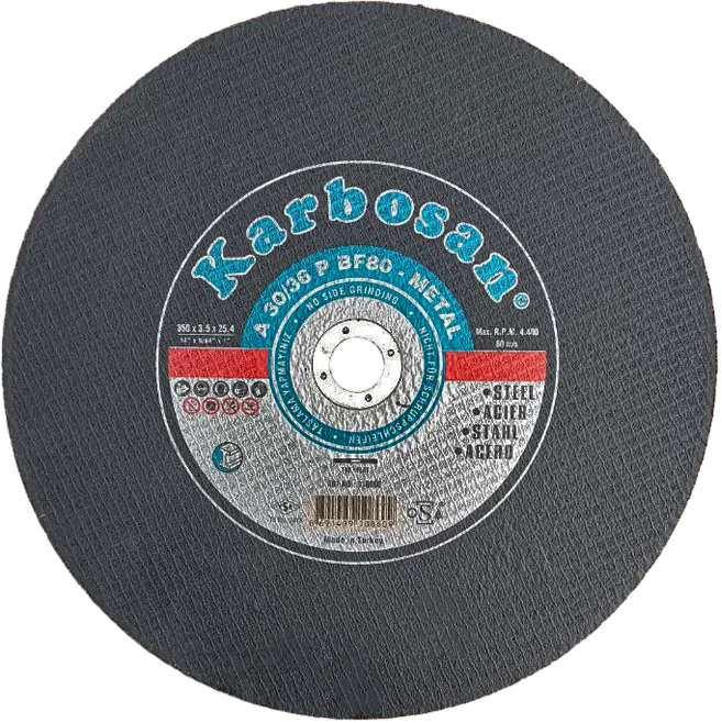 Отрезной круг Karbosan с армированной основой отличается прочностью и долговечностью использования. Изделие из оксида алюминия характеризуется высокой упругостью. Благодаря твердому абразиву обеспечиваются высокие режущие свойства инструменту на длительное время. Работу круга определяют его скорость и подача (перемещение). Максимальная частота вращения круга Karbosan A36/46P составляет 80 м/с.