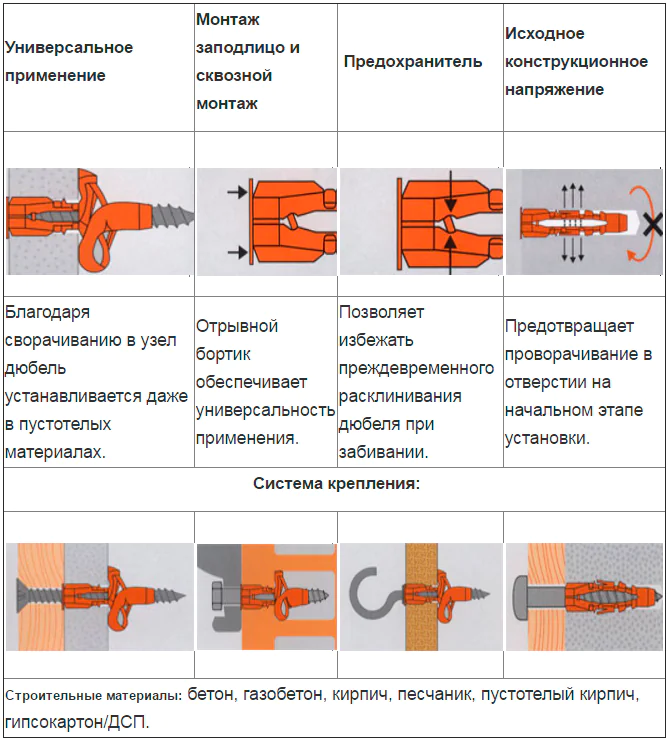 Универсальный дюбель из полипропилена с повышенной эластичностью предназначен для использования его как в сплошном основании, так и в полостной кладке (полые бетонные блоки, кирпич с отверстиями и так далее). В плотной кладке дюбель ведет себя как обычный трехлепестковый дюбель и обладает всеми его преимуществами. При попадании в полость дюбель наворачивается на шуруп и завязывается в плотный узел, который надежно крепит шуруп в стене.