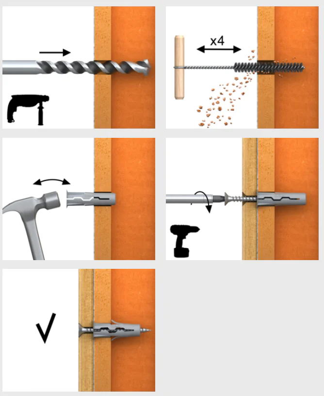 Противовращательные упоры предотвращают вращение рубашки дюбеля в отверстии во время монтажа.