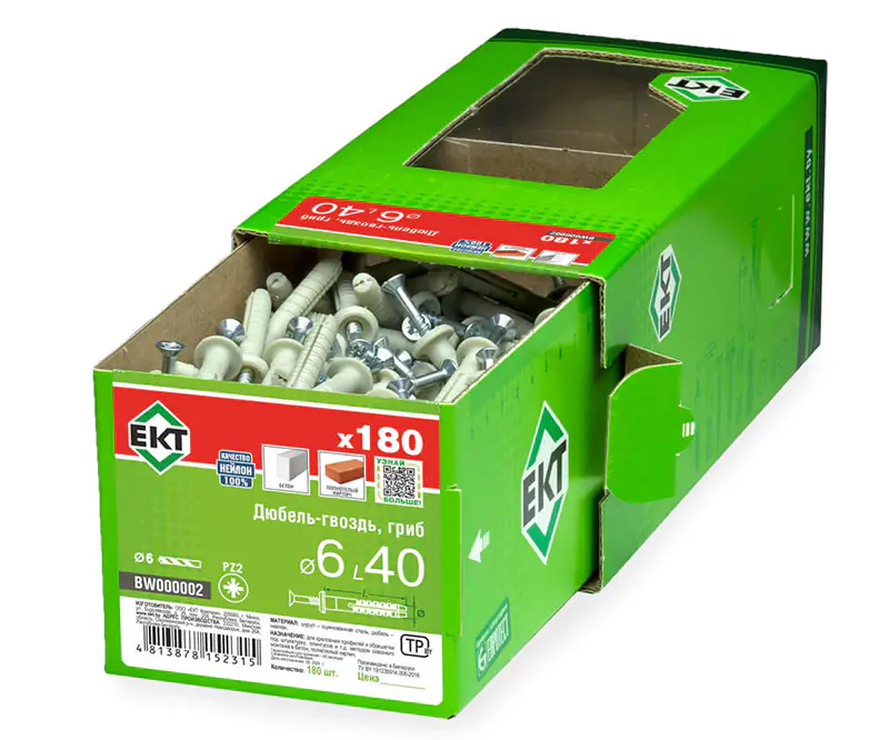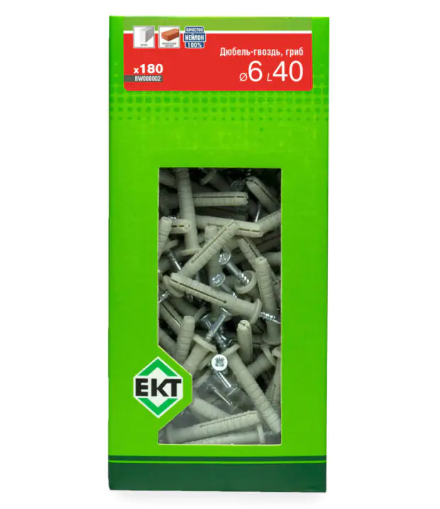 Дюбель быстрого монтажа (дюбель-гвоздь) 6х40 ЕКТ GL НЕЙЛОН предназначен для организации креплений с небольшими нагрузками в основных стеновых материалах. Монтируются как закручиванием, так и забиванием гвоздевого шурупа. Поставляются в предварительно-собранном состоянии, что позволяет повысить удобство и сократить скорость монтажа. В пачке 180 штук.