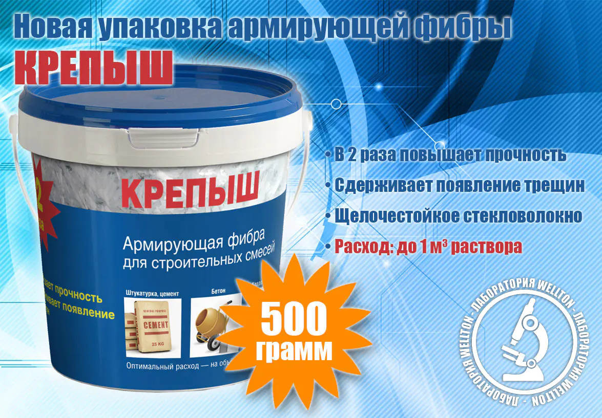 Армирующая фибра для сухих строительных смесей "Крепыш" – это высокотехнологичный компонент для укрепления различных строительных смесей (бетон, цемент, штукатурка, стяжка). Повысить в разы прочность бетонного или кладочного раствора можно добавив лишь несколько грамм армирующей фибры "Крепыш".