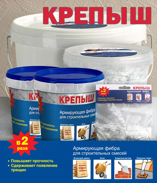 Известно, что стекловолокно – это невероятно прочный материал. Волокно из стекла намного прочнее, чем стальная нить такого же диаметра. Именно поэтому, раствор с добавлением «Крепыша» становится в несколько раз прочнее, что подтверждено многочисленными экспериментами! Таким образом «Крепыш» может заменить привычную штукатурную стеклосетку, экономя не только средства, но и драгоценное время.
