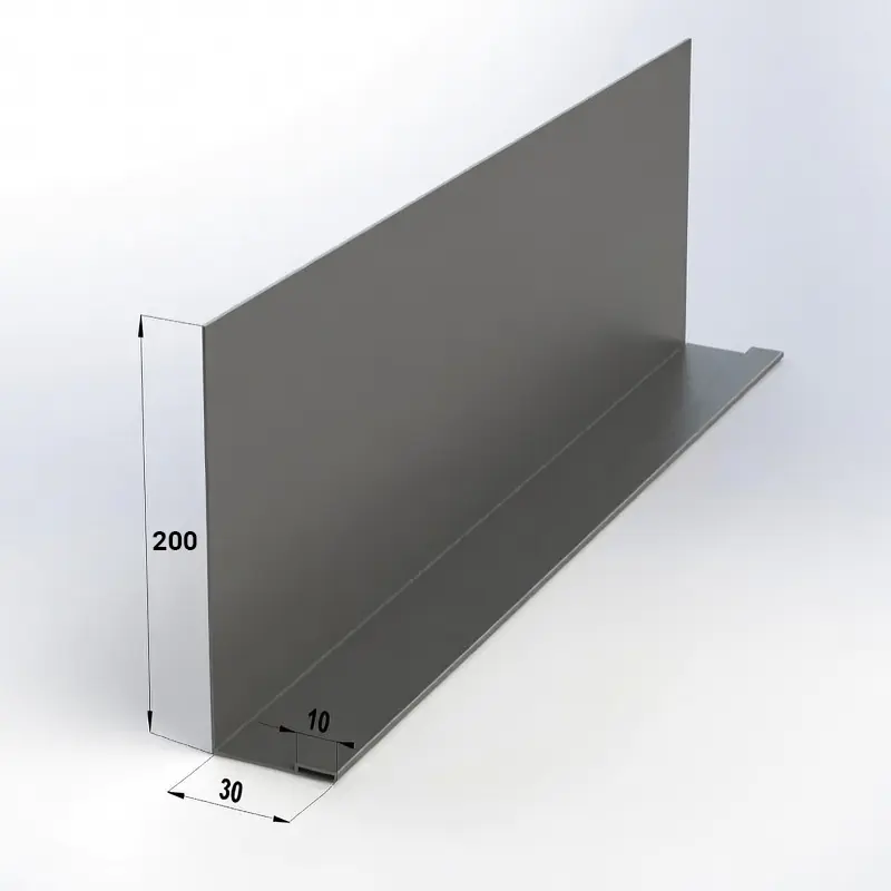 Лобовая планка – это и функциональный, и декоративный элемент кровельной системы. Главная задача – защита лобовой доски на фронтоне карниза от воздействия окружающей среды. На нее же крепится водосточная система. Цвет: RAL7024 (серый). Длина 2 м. Стороны 200 мм и 30 мм.