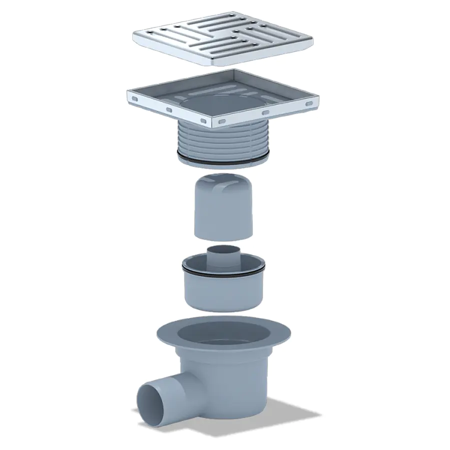 Трап для душа АНИ Пласт TA5612 — это горизонтальный регулируемый сливной трап с гидрозатвором, предназначенный для отвода воды из душевой комнаты в канализацию. Модель оснащена горизонтальным регулируемым выпуском из пластика диаметром 50 мм и решёткой из нержавеющей стали размером 150×150 мм. Пропускная способность — 45 л/мин, высота гидрозатвора — 28 мм, минимальная монтажная высота — от 75 мм. Корпус выполнен с широкой юбкой для надёжной фиксации гидроизоляции, а четыре опорные ноги с регулировкой высоты обеспечивают точный монтаж по уровню. Решётка выдерживает статическую нагрузку до 300 кг. Конструкция препятствует попаданию загрязняющих частиц в канализацию, предотвращает засоры и легко чистится.