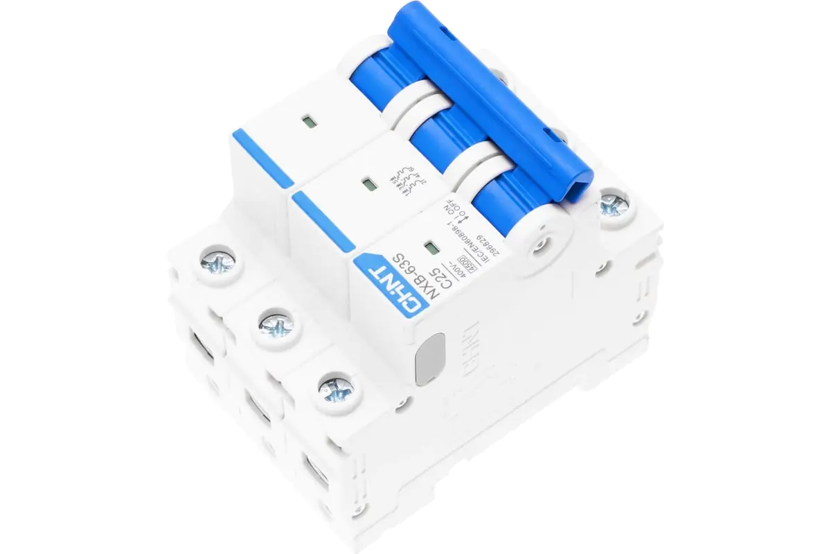 Автоматический выключатель CHINT NXB-63S 3P 25A 4,5кА тип C используется для защиты распределительных и групповых цепей от перегрузок и короткого замыкания. Применяется во вводно-распределительных щитах жилых и административных зданий или в промышленности.