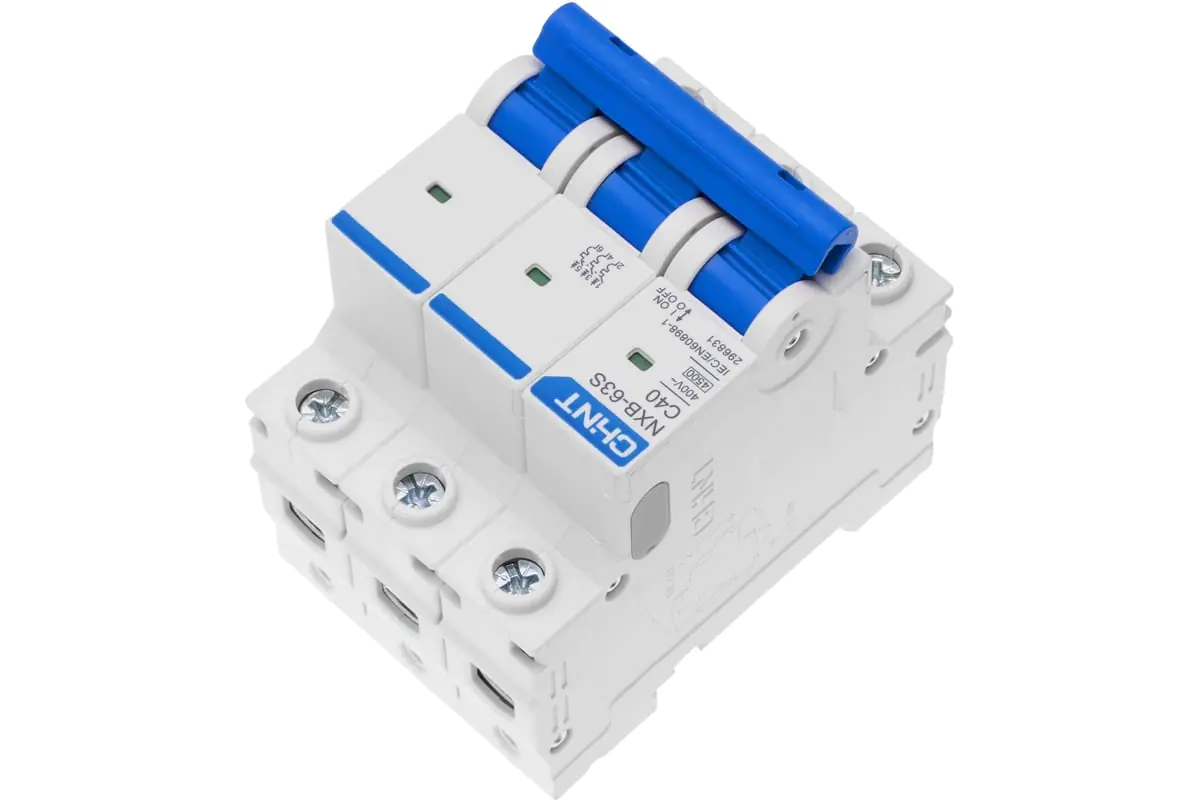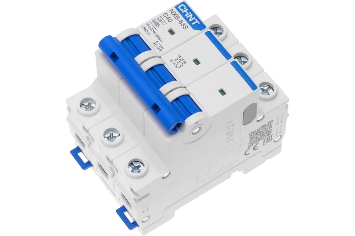 Автоматический выключатель CHINT NXB-63S 3P 40A 4,5кА тип C используется для защиты распределительных и групповых цепей от перегрузок и короткого замыкания. Применяется во вводно-распределительных щитах жилых и административных зданий или в промышленности.
