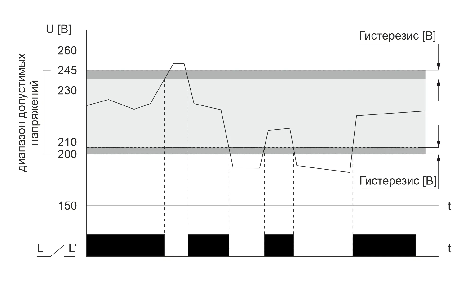 Контакт реле замкнут и нагрузка включена, если контролируемое напряжение находится в установленном диапазоне. Диапазон (верхнее и нижнее значения) устанавливается посредством кнопок на лицевой панели. Повторное включение реле (после отключения) происходит автоматически, через установленное время, после восстановления сетевого напряжения. В случае восстановления после отсутствия напряжения время АПВ увеличивается на величину времени готовности устройства.