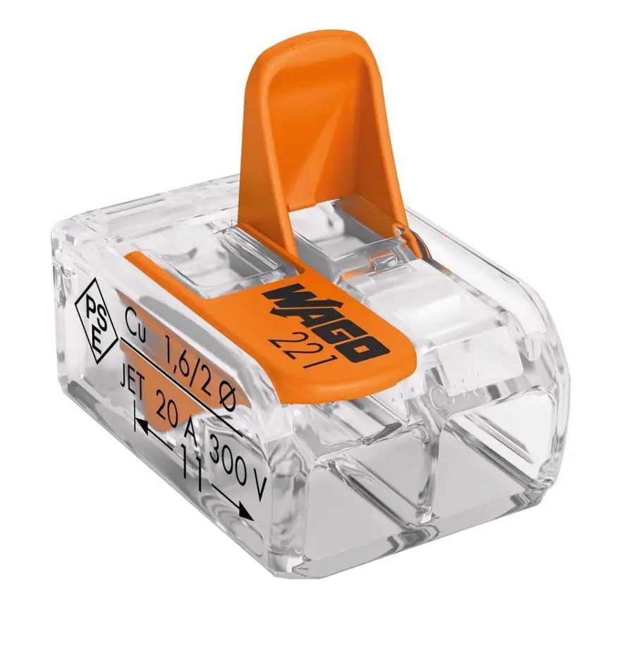Клеммы Wago предназначены для подключения любых типов медных проводников: моножильных и многопроволочных, применяются в распределительных коробках. Клеммы Wago серии 221 на 40% меньше и компактнее, чем клеммы серии 222.