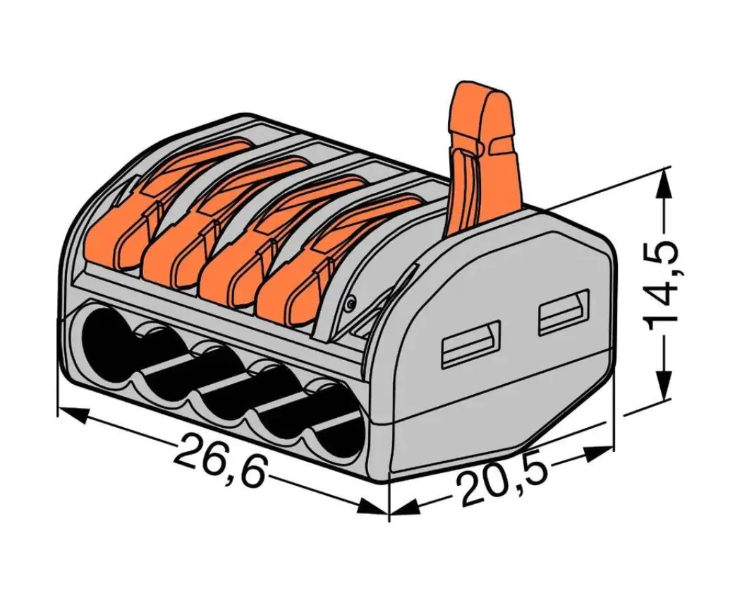 5-и проводная соединительная клемма Wago 222-415 – это особое приспособление, предназначенное для соединения одно- и многожильных алюминиевых и медных кабелей. Обеспечивает надёжное и безопасное соединение всех узлов проводки. Проводящая часть соединителя изготовлена из меди.