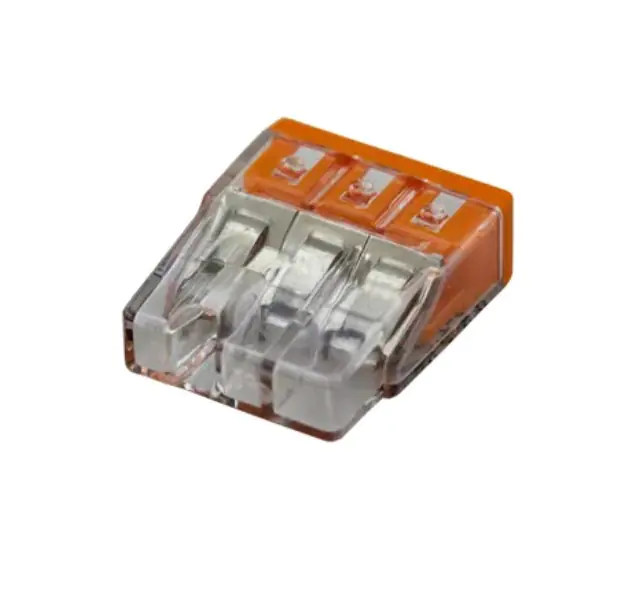 Корпус клеммы Wago 2273-203 оснащен удобными тестовыми гнездами, также он выполнен из прозрачного термоустойчивого пластика для визуального контроля соединения. Наличие смотрового отверстия исключает необходимость вскрывать корпус, что делает работу безопасной и быстрой. Применение клемм Wago увеличивает надежность работы приборов и снижает риск возгорания электросистем.