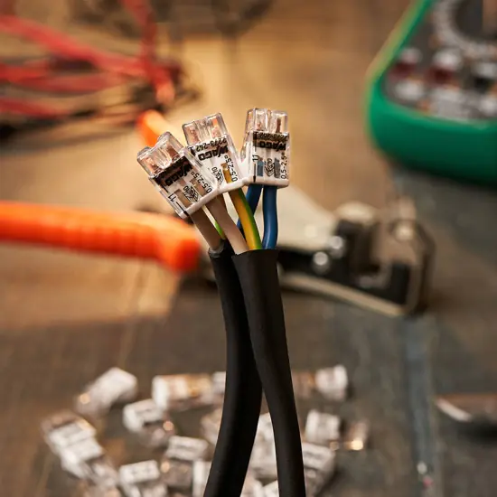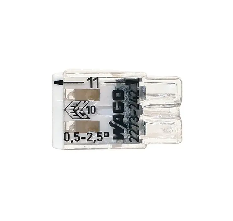 Прозрачный корпус позволяет визуально контролировать правильность положения проводника и длину снятия изоляции. Проводящая часть соединителя изготовлена из меди.